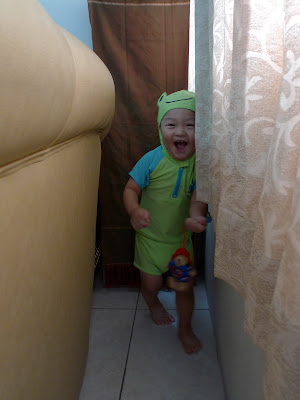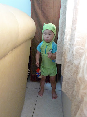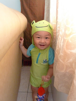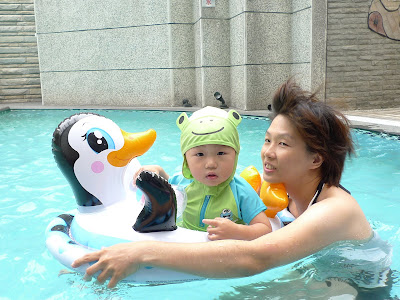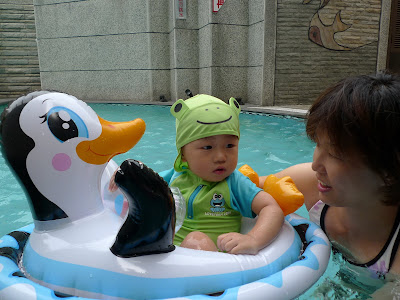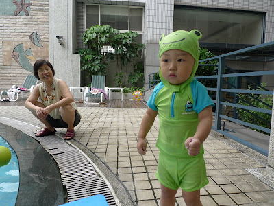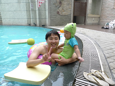 阿爸阿母前一天便興沖沖地跑去買了游泳尿布(真是夭壽貴的啦, 一片就要五十幾塊台票), 又跑去中友買了小人的泳衣, 幸好聽阿爸的意見買了含上身的, 不然覺得小孩真的容易覺得冷哩!