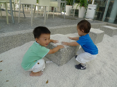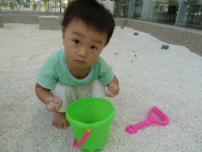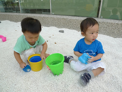 梨子在台中算是熱門聚會餐廳, 尤其是假日, 通常要先預約, 不然用餐時間幾乎都沒位子。心肺之前就跟我們說, 這裡有一處戶外庭院, 全是白色小石頭, 小朋友蠻適合在那兒玩的, 最好自備玩沙器具及替換衣物, 所以我可是有備而來啊。