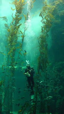 高達數十公尺的海藻森林, 看到有小人在下面當比例尺嗎? 我們還碰巧遇到工作人員餵食時間。