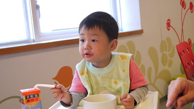 假日果然不一樣, 即使是淡季, 整個餐廳滿滿的都是人, 可以想見旺季時一定擁擠的可怕。因為人太多, 食物常常供不應求, 可以看出餐飲部已經很努力在補貨了, 不過有一些東西還是要等一下才有。我照樣大吃特吃, 而小人今天還是不肯好好吃飯, 枉費我早上牛奶特地只意思一下給個120cc, (不給又不行, 他早上起床第一件事就是要ㄋㄟㄋㄟ), 看別桌有的小朋友又吃麵包又吃蛋的, 真令我羨慕啊。