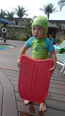 用過餐後我們又繞到泳池區去散散步, 看到有小人兒泡在泳池裡, 天氣也挺熱的, 阿母想想帶了泳衣來都沒下水真是太可惜了, 就讓蘇小蓮帶著兒子去泳池泡泡水。