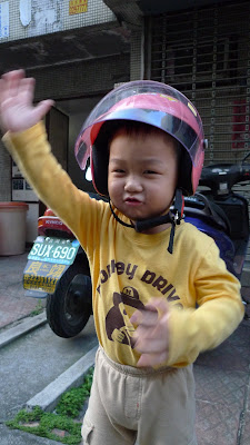 2. 語言發展: 這四個月來最值得一提的就是這一項囉。彷彿開竅似的, 突然會講好多話了, 聒噪的很, 而且句子還挺完整的, 會用"因為..." "可是..."的句型了。還有這是一段問"為什麼"的大爆發時期, 可以無窮止盡地老天荒地問下去, 問到阿爸阿母完全不知如何回答, 只能說"我也不知道(為什麼...)" 然後, 這小子就把這一句學起來, 會在很高明的地方用"我也不知道為什麼, 或, 我也不知道這是什麼..."