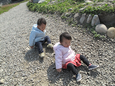 在我們四人快樂地在溼地上探險時, 其他人則在岸上的涼亭附近, 彥維哥哥很會照顧小朋友喲, 瞧他跟金金銀銀玩石頭玩得很開心。